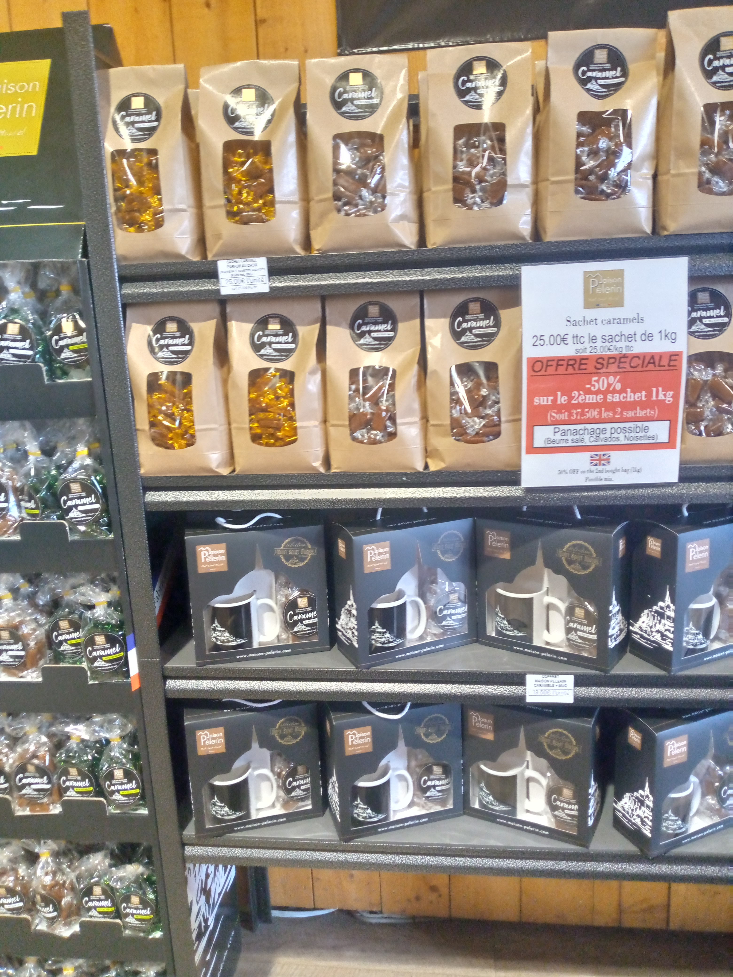 Plein de produit locaux, caramel au beurre salé, mentholé, du nougats au différent goût, biscuits objets en tout genre boutique très sympa, à voir au mont Saint Michel