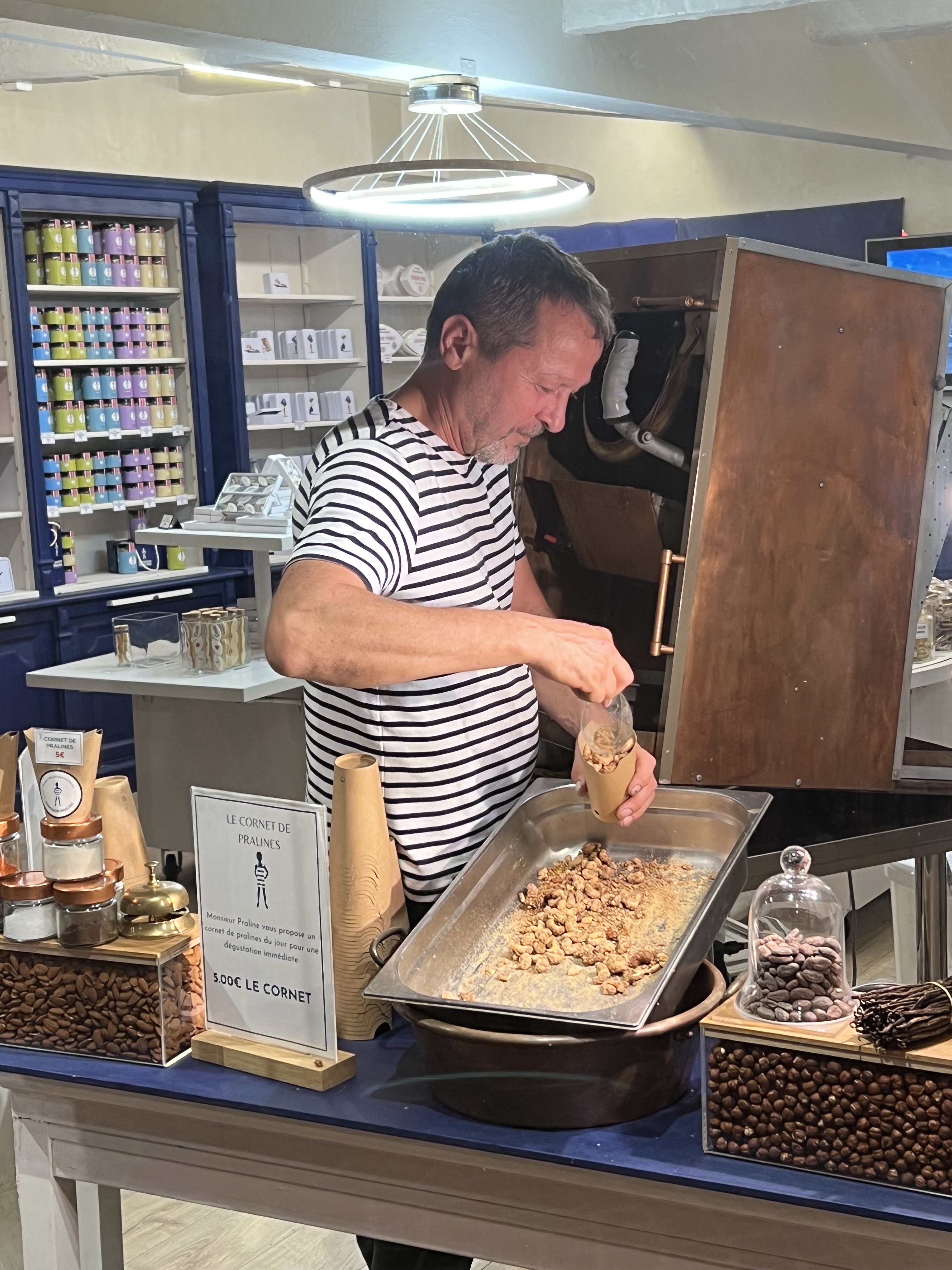Excellente boutique de pralines artisanales très peu sucrées et caramélisées au chaudron sous nos yeux. Les aromatisations sont insolites : du gingembre à la truffe pour les plus gourmets ! Attention aux avis Google nous dit le patron maître artisan, il reste des avis négatifs de l'ancien restaurant qui pénalise toujours la note globale (Google peine à différencier les enseignes ?). En plus des pralines, nous avons goûté (et acheté) des navettes revisitées aux bons goûts de Monsieur Praline, ainsi que différentes fèves et noix travaillées dans l'atelier (cajou, pécan, fève de cacao...). Nous reviendrons !!!